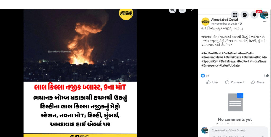 એક સોશિયલ મીડિયા યુઝર દ્વારા 10 નવેમ્બર, 2025ના રોજ એક પોસ્ટ શેર કરવામાં આવી હતી. પોસ્ટમાં મૂકવામાં આવેલા ફોટોના શીર્ષકમાં એવું લખવામાં આવ્યું છે કે, લાલ કિલ્લા નજીક બ્લાસ્ટ, 9ના મોT. ભયાનક બોમ્બ ધડાકાથી હચમચી ઉઠ્યું દિલ્હીના લાલ કિલ્લા નજીકનું મેટ્રો સ્ટેશન, નવના મોત; દિલ્હી, મુંબઈ, અમદાવાદ હાઈ એલર્ટ પર. આ ફોટો સાથેના લખાણમાં એવો દાવો કરવામાં આવી રહ્યો છે કે, તાજેતરમાં દિલ્હીના લાલ કિલ્લા નજીક થયેલા બ્લાસ્ટનો તેનો આ ફોટો છે.