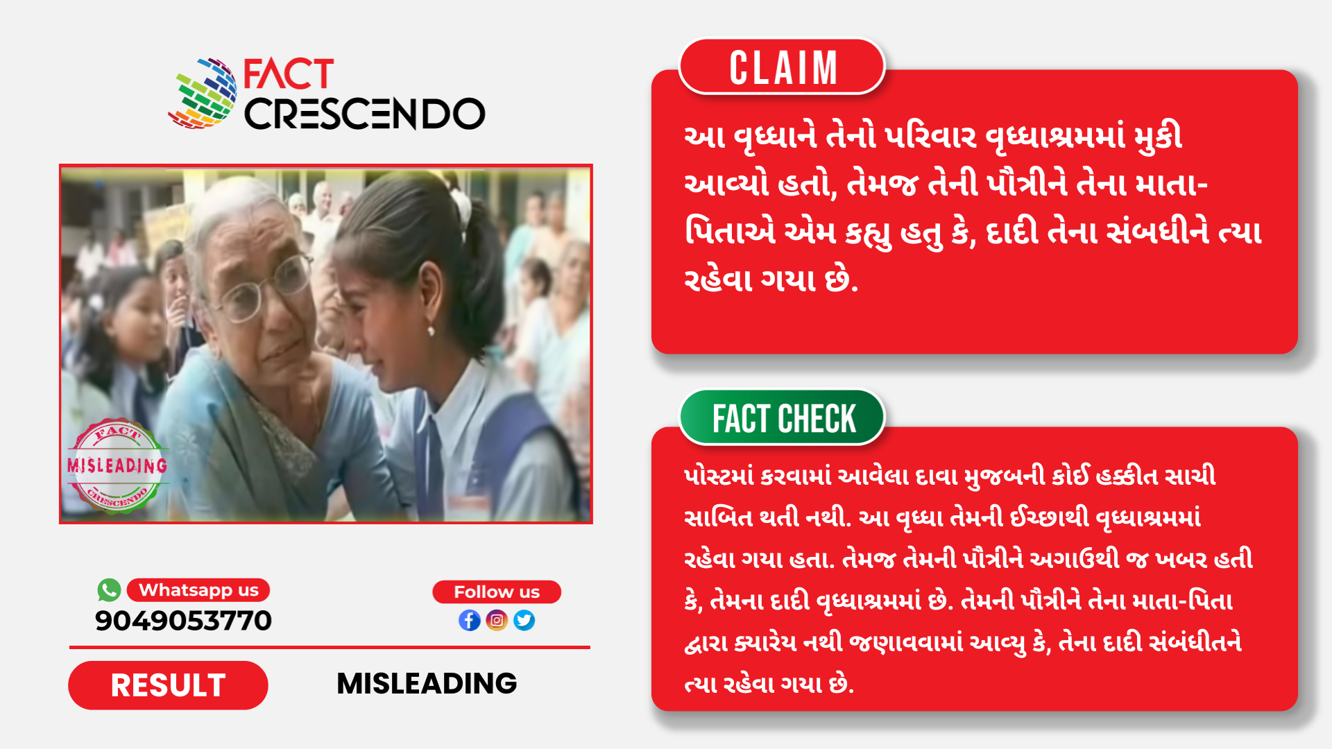 આમ, અમારી પડતાલમાં ઉપરોક્ત પોસ્ટ ખોટી સાબિત થાય છે. કારણ કે, પોસ્ટમાં કરવામાં આવેલા દાવા મુજબની કોઈ હક્કીત સાચી સાબિત થતી નથી. આ વૃધ્ધા તેમની ઈચ્છાથી વૃધ્ધાશ્રમમાં રહેવા ગયા હતા. તેમજ તેમની પૌત્રીને અગાઉથી જ ખબર હતી કે, તેમના દાદી વૃધ્ધાશ્રમમાં છે. તેમની પૌત્રીને તેના માતા-પિતા દ્વારા ક્યારેય નથી જણાવવામાં આવ્યુ કે, તેના દાદી સંબંધીતને ત્યા રહેવા ગયા છે.