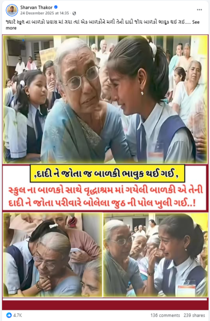 સોશિયલ મીડિયા યુઝર્સ દ્વારા તારીખ 24 ડિસેમ્બર 2025ના એક પોસ્ટ શેર કરવામાં આવી હતી. આ પોસ્ટમાં દાવો કરવામાં આવ્યો હતો કે, “આ વૃધ્ધાને તેનો પરિવાર વૃધ્ધાશ્રમમાં મુકી આવ્યો હતો, તેમજ તેની પૌત્રીને તેના માતા-પિતાએ એમ કહ્યુ હતુ કે, દાદી તેના સંબધીને ત્યા રહેવા ગયા છે.”