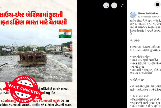 તાજેતરમાં સોશિયલ મીડિયા પર એક ફોટો વાયરલ થઈ રહ્યો છે. જેમાં પોસ્ટમાં મૂકવામાં આવેલા ફોટા સાથેના લખાણમાં એવો દાવો કરવામાં આવી રહ્યો છે કે, આ ફોટો તાજેતરમાં સાઉથ-ઈસ્ટ એશિયાના દેશોમાં આવેલા દિતવાહ વાવાઝોડાને કારણે સર્જાયેલી પરિસ્થિતિનો છે. પરંતુ ફેક્ટ ક્રેસેન્ડોની પડતાલમાં આ દાવો ખોટો હોવાનું સાબિત થાય છે કારણ કે, પોસ્ટ સાથે શેર કરવામાં આવેલો […]