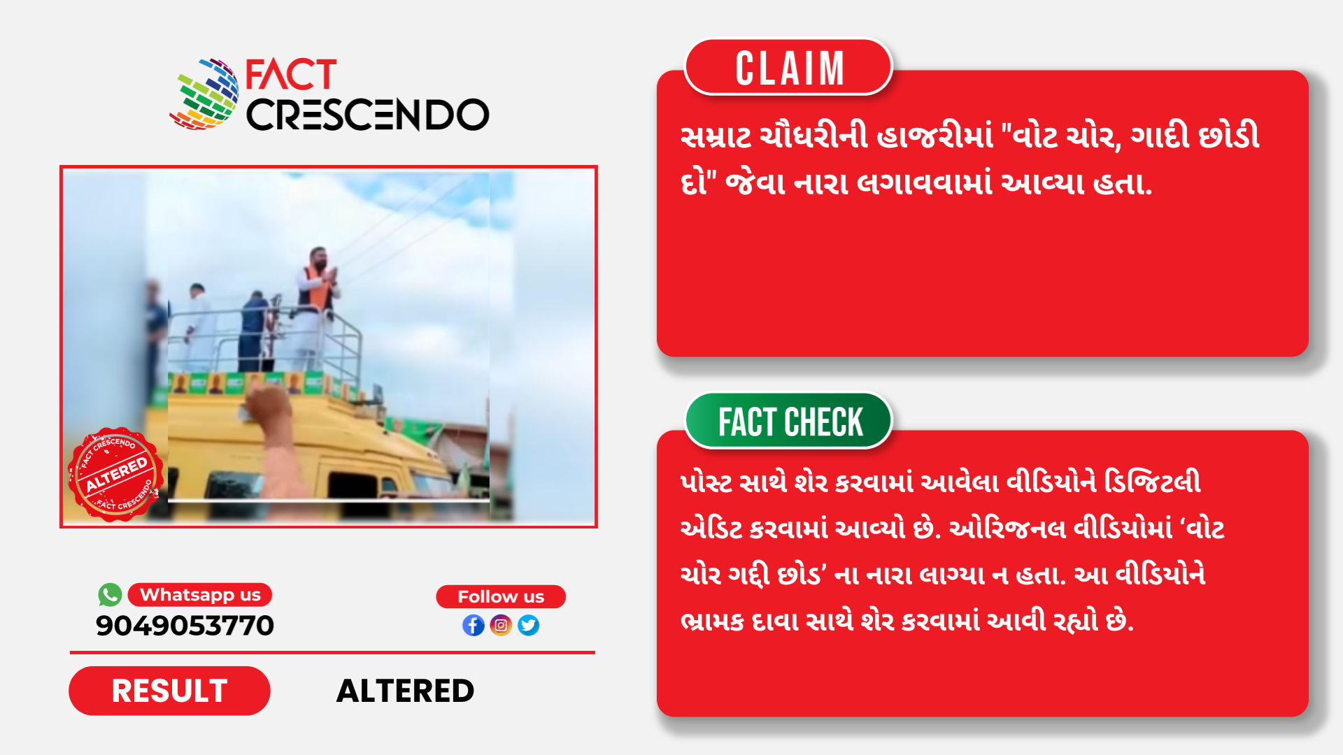 Title:બિહારના નાયબ મુખ્યમંત્રી સમ્રાટ ચૌધરીની રેલીમાં ‘વોટ ચોર, ગાદી છોડી દો’ જેવા નારા લાગ્યા હોવાનો દાવો ખોટો છે… જાણો શું છે સત્ય….