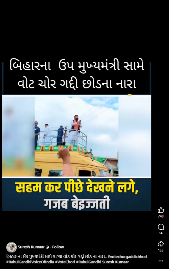 આમ, અમારી પડતાલમાં ઉપરોક્ત પોસ્ટ ખોટી સાબિત થાય છે. કારણ કે, પોસ્ટ સાથે શેર કરવામાં આવેલા વીડિયોને ડિજિટલી એડિટ કરવામાં આવ્યો છે. ઓરિજનલ વીડિયોમાં ‘વોટ ચોર ગદ્દી છોડ’ ના નારા લાગ્યા ન હતા. આ વીડિયોને ભ્રામક દાવા સાથે શેર કરવામાં આવી રહ્યો છે.