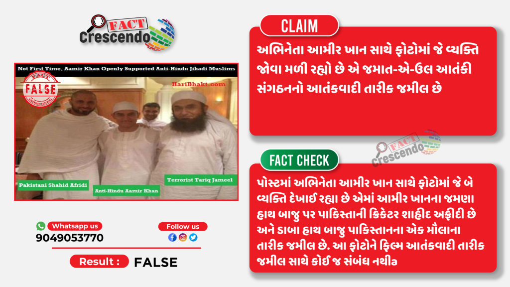 તાજેતરમાં સોશિયલ મીડિયા પર બોલીવુડના બોયકોટના સમાચારોએ જોર પકડ્યું છે ત્યારે સોશિયલ મીડિયા પર અભિનેતા આમીર ખાનનો એક ફોટો વાયરલ થઈ રહ્યો છે. જેની સાથે લખાણમાં એવો દાવો કરવામાં આવી રહ્યો છે કે, અભિનેતા આમીર ખાન સાથે ફોટોમાં જે વ્યક્તિ જોવા મળી રહ્યો છે એ જમાત-એ-ઉલ આતંકી સંગઠનનો આતંકવાદી તારીક જમીલ છે. પરંતુ ફેક્ટ ક્રેસેન્ડોની પડતાલમાં આ દાવો ખોટો અને પાયાવિહોણો હોવાનું સાબિત થાય છે કારણ કે, પોસ્ટમાં અભિનેતા આમીર ખાન સાથે ફોટોમાં જે બે વ્યક્તિ દેખાઈ રહ્યા છે એમાં આમીર ખાનના જમણા હાથ બાજુ પર પાકિસ્તાની ક્રિકેટર શાહીદ અફ્રીદી છે અને ડાબા હાથ બાજુ પાકિસ્તાનના એક મૌલાના તારીક જમીલ છે. આ ફોટોને ફિલ્મ આતંકવાદી તારીક જમીલ સાથે કોઈ જ સંબંધ નથી. આ ફોટોને સોશિયલ મીડિયા પર ખોટી અને ભ્રામક રીતે લોકોને ગેરમાર્ગે દોરવા વાયરલ કરવામાં આવી રહ્યો છે.