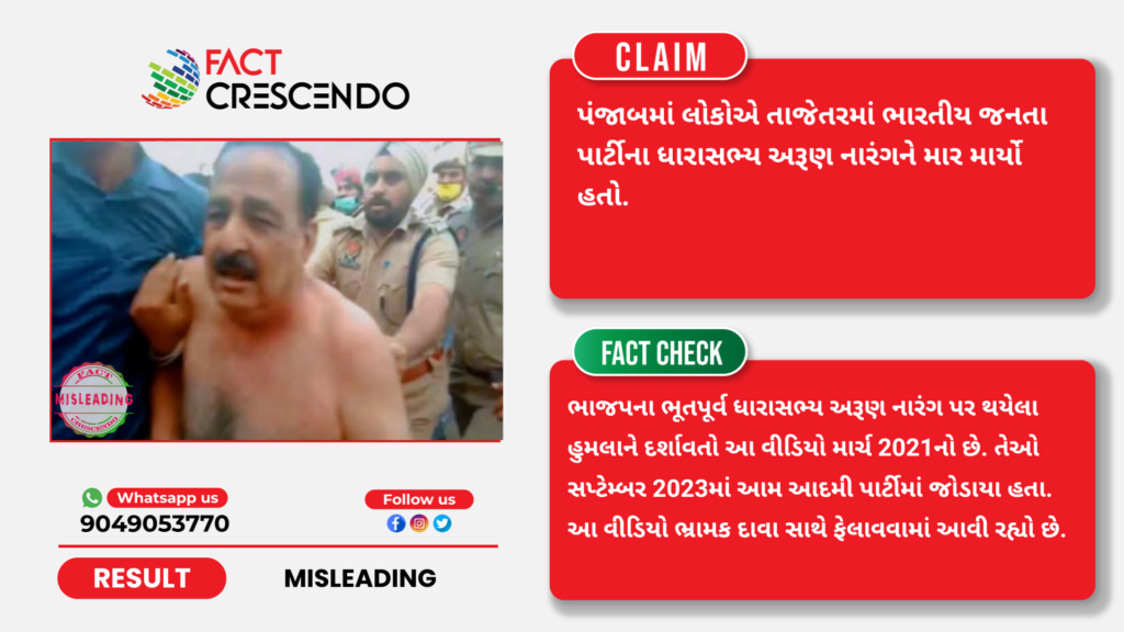 આમ, અમારી પડતાલમાં ઉપરોક્ત પોસ્ટ ખોટી સાબિત થાય છે. કારણ કે, ભાજપના ભૂતપૂર્વ ધારાસભ્ય અરૂણ નારંગ પર થયેલા હુમલાને દર્શાવતો આ વીડિયો માર્ચ 2021નો છે. તેઓ સપ્ટેમ્બર 2023માં આમ આદમી પાર્ટીમાં જોડાયા હતા. આ વીડિયો ભ્રામક દાવા સાથે ફેલાવવામાં આવી રહ્યો છે.