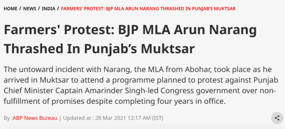 તેમજ વધુ સર્ચ કરતા અમને એબીપી લાઈવ વેબસાઇટ પર 28 માર્ચ 2021ના પ્રકાશિત થયેલો અહેવાલ પ્રાપ્ત થયો હતો. જેની સાથે માહિતી આપવામાં આવી હતી કે, “પંજાબના મુક્તસર જિલ્લાના માલૌત શહેરમાં ત્રણ કૃષિ કાયદાઓનો વિરોધ કરી રહેલા ખેડૂતોએ ભાજપના ધારાસભ્ય અરૂણ નારંગ પર કથિત રીતે હુમલો કર્યો, તેમના કપડાં ફાડી નાખ્યા અને તેમના પર કાળી શાહી ફેંકી. આ ઘટના ત્યારે બની જ્યારે નારંગ મુક્તસરમાં એક કાર્યક્રમમાં હાજરી આપવા પહોંચ્યા હતા. આ કાર્યક્રમ પંજાબના મુખ્યમંત્રી કેપ્ટન અમરિંદર સિંહના નેતૃત્વ હેઠળની કોંગ્રેસ સરકાર સામે વિરોધ પ્રદર્શન કરવા માટે આયોજિત કરવામાં આવ્યો હતો.”
