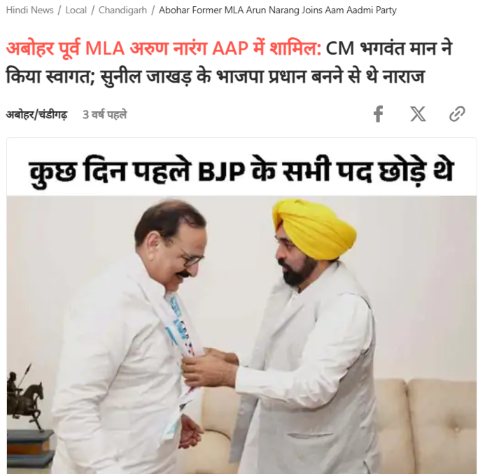 તેમજ વધુ સર્ચ કરતા અમને દૈનિક ભાસ્કરનો એક અહેવાલ પ્રાપ્ત થયો હતો. જેની સાથે માહિતી આપવામાં આવી હતી કે, “પૂર્વ ધારાસભ્ય અરૂણ નારંગ આમ આદમી પાર્ટી (AAP)માં જોડાયા છે. તેમણે 2022ની વિધાનસભા ચૂંટણી ભાજપની ટિકિટ પર લડી હતી, જેમાં તેમનો પરાજય થયો હતો.