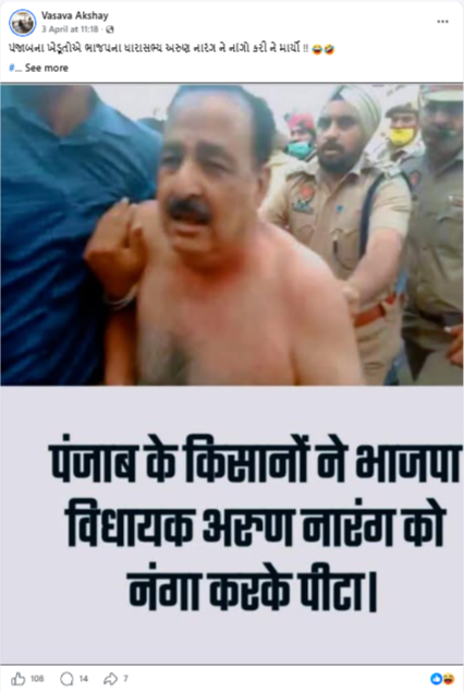 પંજાબમાં 2027 ની વિધાનસભા ચૂંટણી પહેલા, સોશિયલ મીડિયા પર એક વીડિયો વાયરલ થઈ રહ્યો છે. તેમાં પોલીસ કર્મચારીઓ લોકોના ટોળામાંથી એક નગ્ન વ્યક્તિને બચાવતા જોઈ શકાય છે. આ વીડિયો શેર કરીની દાવો કરવામાં આવી રહ્યો છે કે, “પંજાબમાં લોકોએ તાજેતરમાં ભારતીય જનતા પાર્ટીના ધારાસભ્ય અરૂણ નારંગને માર માર્યો હતો.