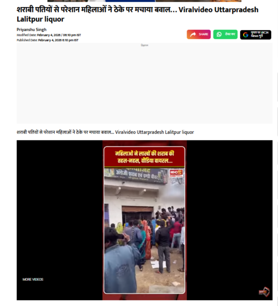 ઉપરોક્ત પોસ્ટમાં કરવામાં આવેલા દાવાની સત્યતા તપાસવી જરૂરી જણાતાં અમે અમારી પડતાલ/તપાસ કાર્યવાહી શરૂ કરી હતી. સૌપ્રથમ અમે પોસ્ટમાં મૂકવામાં આવેલા વીડિયોનો એક સ્ક્રિનશોટ લઈ ગૂગલ રિવર્સથી સર્ચ કરતાં પોસ્ટમાં મૂકવામાં આવેલા આ જ વીડિયો સાથેના સમાચાર ibc24.in દ્વારા 4 ફેબ્રુઆરી, 2026ના રોજ પ્રસારિત કરવામાં આવ્યા હોવાની માહિતી પ્રાપ્ત થઈ હતી. જેમાં એવી માહિતી આપવામાં આવી હતી કે, ઉત્તરપ્રદેશના લલિતપુર ખાતે શરાબી પતિઓથી પરેશાન મહિલાઓએ દારુના અડ્ડા પર જઈને બબાલ કરી અને તોડફોડ પણ કરી હતી.. જેના પરથી એ સ્પષ્ટ સાબિત થાય છે કે, પોસ્ટમાં મૂકવામાં આવેલો વીડિયોને ગુજરાત સાથે કોઈ જ સંબંધ નથી.