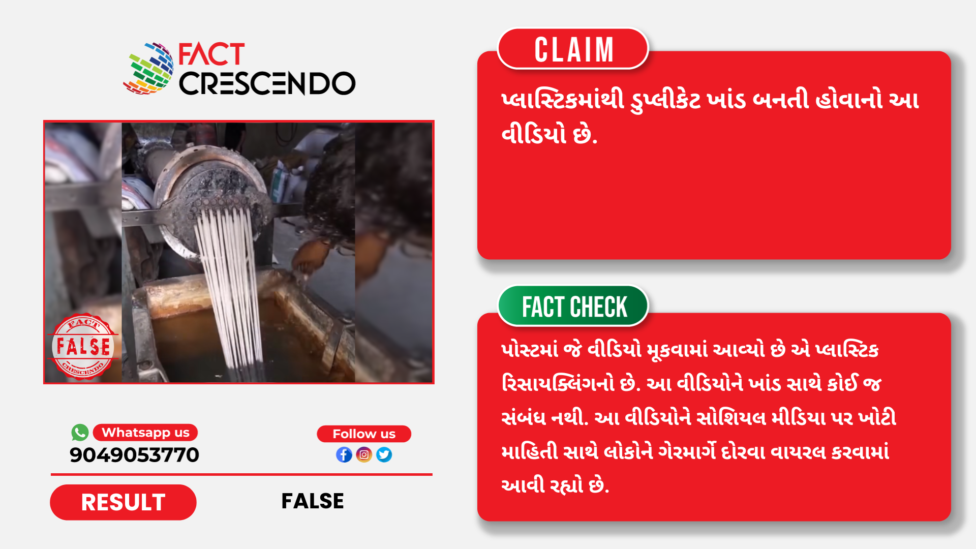 તાજેતરમાં સોશિયલ મીડિયા પર એક વીડિયો વાયરલ થઈ રહ્યો છે. આ વીડિયો સાથેના લખાણમાં એવો દાવો કરવામાં આવી રહ્યો છે કે, પ્લાસ્ટિકમાંથી ડુપ્લીકેટ ખાંડ બનતી હોવાનો આ વીડિયો છે. પરંતુ ફેક્ટ ક્રેસેન્ડોની પડતાલમાં આ દાવો ખોટો અને પાયાવિહોણો હોવાનું સાબિત થાય છે કારણ કે, પોસ્ટમાં જે વીડિયો મૂકવામાં આવ્યો છે એ પ્લાસ્ટિક રિસાયક્લિંગનો છે. આ વીડિયોને ખાંડ સાથે કોઈ જ સંબંધ નથી. આ વીડિયોને સોશિયલ મીડિયા પર ખોટી માહિતી સાથે લોકોને ગેરમાર્ગે દોરવા વાયરલ કરવામાં આવી રહ્યો છે.