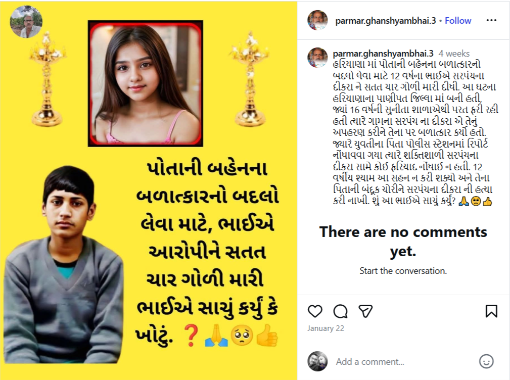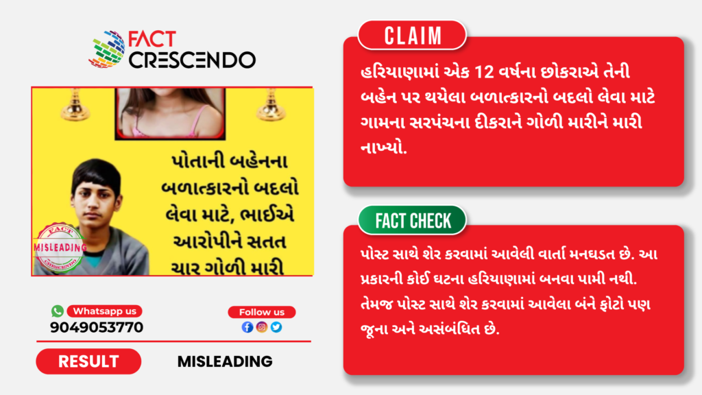 હાલ સોશિયલ મીડિયામાં એક વાર્તા સાથે બે ફોટા વાયરલ થઈ રહ્યા છે. આ પોસ્ટને  શેર કરતા યુઝર્સ દાવો કરી રહ્યા છે કે, “હરિયાણામાં એક 12 વર્ષના છોકરાએ તેની બહેન પર થયેલા બળાત્કારનો બદલો લેવા માટે ગામના સરપંચના દીકરાને ગોળી મારીને મારી નાખ્યો.”