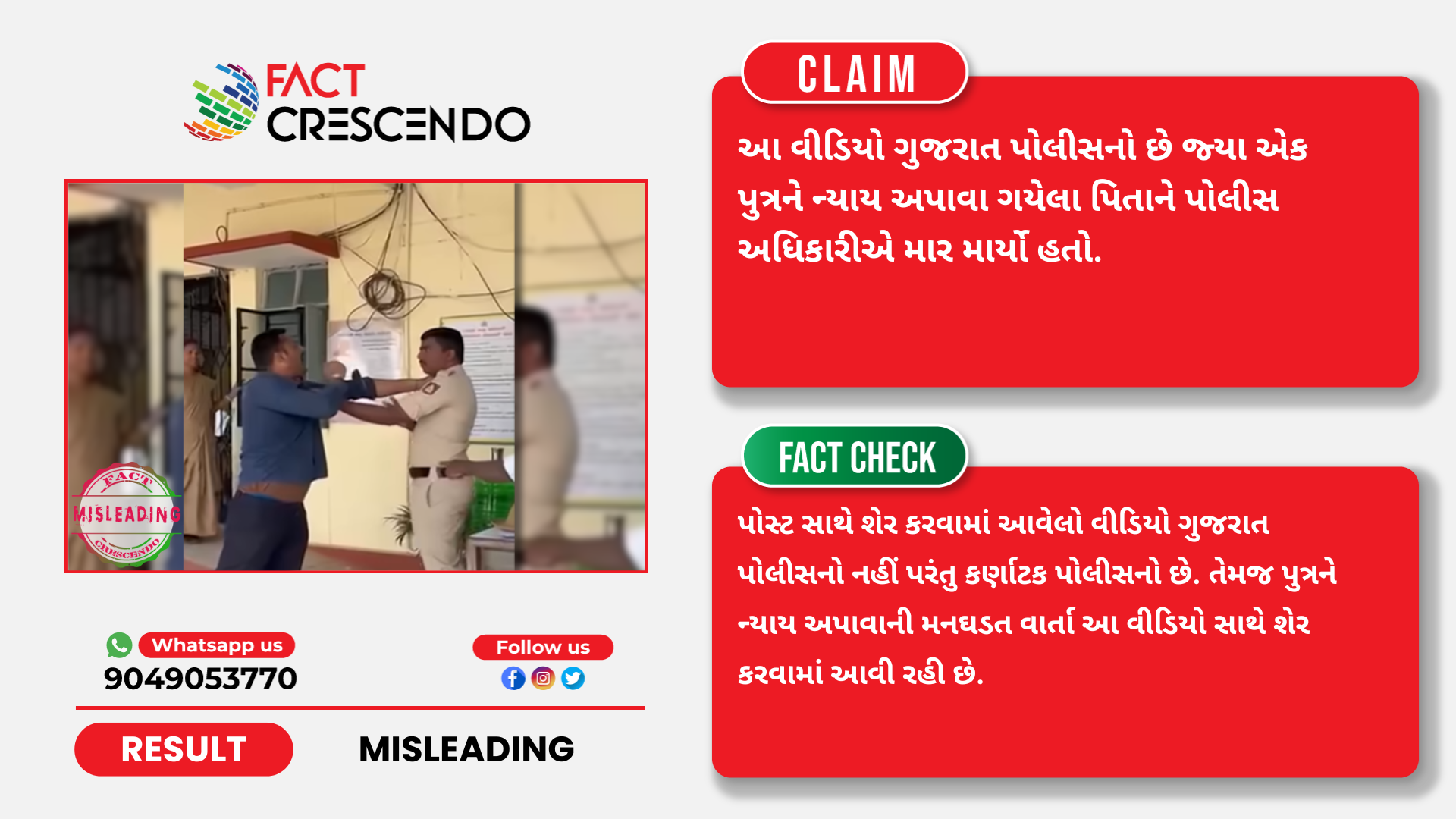 પોસ્ટ સાથે શેર કરવામાં આવેલો વીડિયો ગુજરાત પોલીસનો નહીં પરંતુ કર્ણાટક પોલીસનો છે. તેમજ પુત્રને ન્યાય અપાવાની મનઘડત વાર્તા આ વીડિયો સાથે શેર કરવામાં આવી રહી છે.