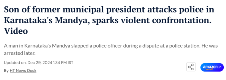 તેમજ વધુ સર્ચ કરતા અમને હિન્દુસ્તાન ટાઈમ્સનો અહેવાલ પ્રાપ્ત થયો હતો. જે અનુસાર, “આ ઘટના માંડ્યા જિલ્લાના પાંડવપુરા પોલીસ સ્ટેશનમાં બની હતી. જમીન વિવાદની ફરિયાદ અંગે પૂછપરછ માટે બોલાવવામાં આવેલા સાગરનો પોલીસ સાથે ઝઘડો થયો. પરિસ્થિતિ વધુ વણસતાં તેણે અધિકારીઓ પર શારીરિક હુમલો કર્યો. તેની સામે કેસ નોંધવામાં આવ્યો હતો અને બાદમાં તેની ધરપકડ કરવામાં આવી હતી.”
