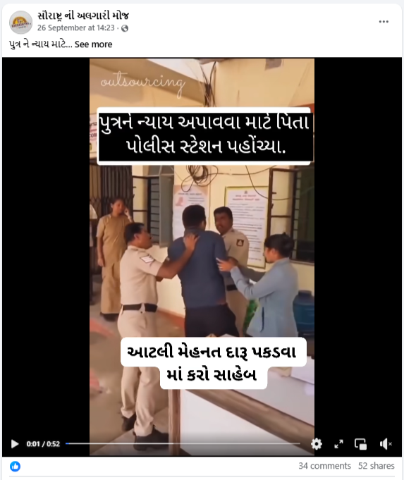 સોશિયલ મીડિયા યુઝર્સ દ્વારા તારીખ 26 સપ્ટેમ્બર 2025ના એક પોસ્ટ શેર કરવામાં આવી હતી. આ પોસ્ટમાં દાવો કરવામાં આવ્યો હતો કે, “આ વીડિયો ગુજરાત પોલીસનો છે જ્યા એક પુત્રને ન્યાય અપાવા ગયેલા પિતાને પોલીસ અધિકારીએ માર માર્યો હતો.”