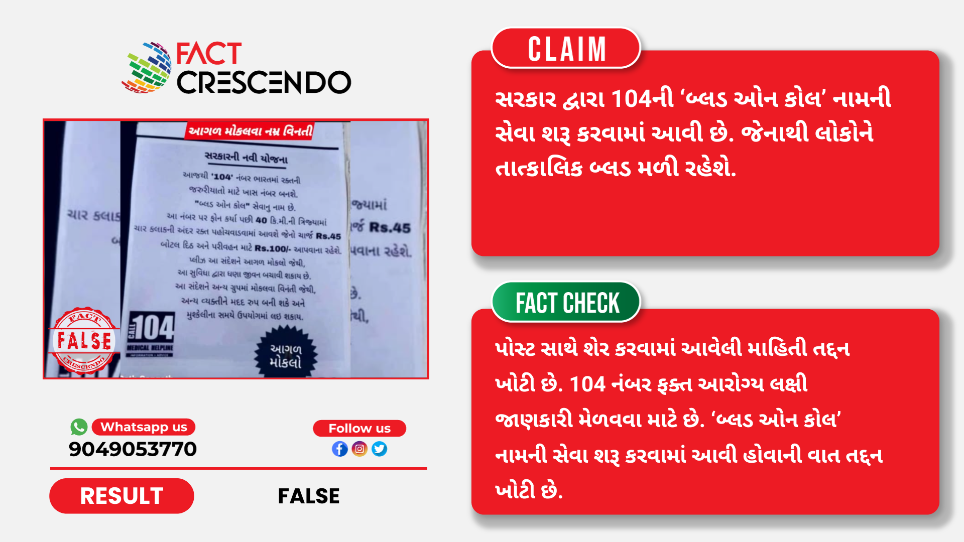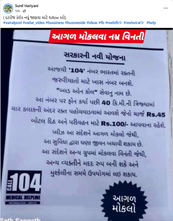 પોસ્ટ સાથે શેર કરવામાં આવેલી માહિતી તદ્દન ખોટી છે. 104 નંબર ફક્ત આરોગ્ય લક્ષી જાણકારી મેળવવા માટે છે. ‘બ્લડ ઓન કોલ’ નામની સેવા શરૂ કરવામાં આવી હોવાની વાત તદ્દન ખોટી છે.