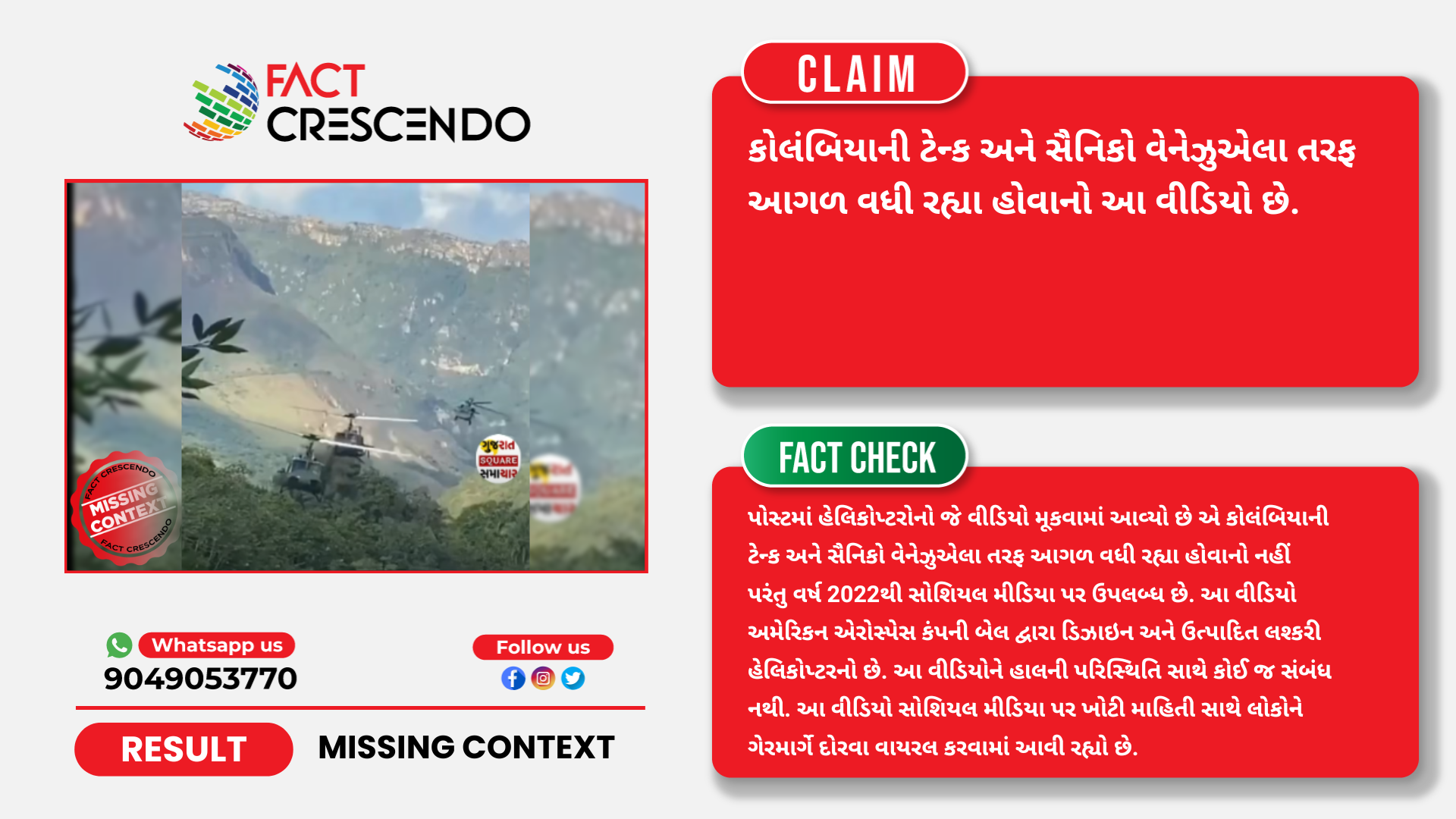 તાજેતરમાં સોશિયલ મીડિયા પર હેલિકોપ્ટરોનો એક વીડિયો વાયરલ થઈ રહ્યો છે જેની સાથે એવો દાવો કરવામાં આવી રહ્યો છે કે, કોલંબિયાની ટેન્ક અને સૈનિકો વેનેઝુએલા તરફ આગળ વધી રહ્યા હોવાનો આ વીડિયો છે. પરંતુ ફેક્ટ ક્રેસેન્ડોની પડતાલમાં આ દાવો ખોટો હોવાનું સાબિત થાય છે કારણ કે, પોસ્ટમાં હેલિકોપ્ટરોનો જે વીડિયો મૂકવામાં આવ્યો છે એ કોલંબિયાની ટેન્ક અને સૈનિકો વેનેઝુએલા તરફ આગળ વધી રહ્યા હોવાનો નહીં પરંતુ વર્ષ 2022થી સોશિયલ મીડિયા પર ઉપલબ્ધ છે. આ વીડિયો અમેરિકન એરોસ્પેસ કંપની બેલ દ્વારા ડિઝાઇન અને ઉત્પાદિત લશ્કરી હેલિકોપ્ટરનો છે. આ વીડિયોને હાલની પરિસ્થિતિ સાથે કોઈ જ સંબંધ નથી. આ વીડિયો સોશિયલ મીડિયા પર ખોટી માહિતી સાથે લોકોને ગેરમાર્ગે દોરવા વાયરલ કરવામાં આવી રહ્યો છે.